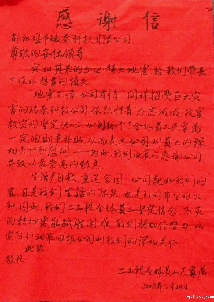 都江堰瑞泰公司二工段全体员工及家属发给公司的感谢信