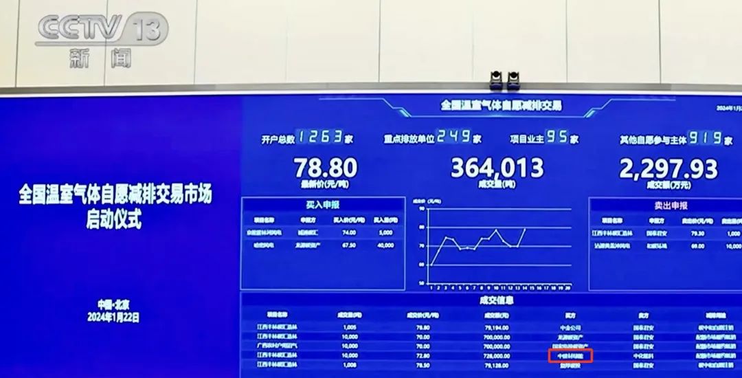 1月22日,全国温室气体自愿减排交易市场启动仪式在北京举行。中共中央政治局常委、国务院副总理丁薛祥出席活动,宣布全国温室气体自愿减排交易市场启动。市场启动首日总成交量37.53万吨,总成交额2383.53万元。 所属中建材绿色能源于首日交易购买1万吨林业碳汇核证自愿减排量(CCER),成为首日交易中交易规模最大的建材行业企业,体现了集团践行国家“双碳”目标、履行社会责任的行动与决心。