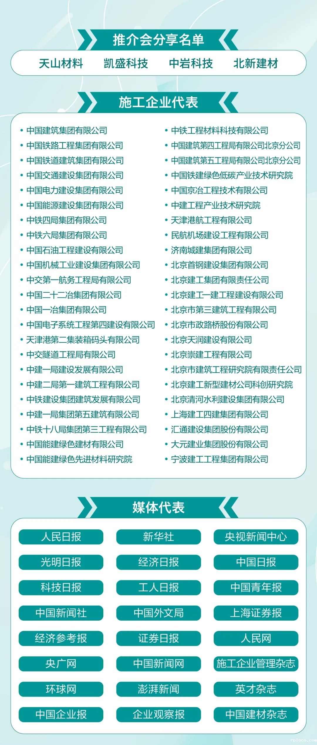 本次工程建设领域业务对接会,将进一步推进与施工企业的沟通交流和广泛合作,中国建筑、中国中铁、中国铁建、中国交建、中国电建、中国能建等40家施工企业代表及多家媒体代表出席会议,集团所属天山材料、凯盛科技、rplsco总院、北新建材将分享最新材料与技术成果。