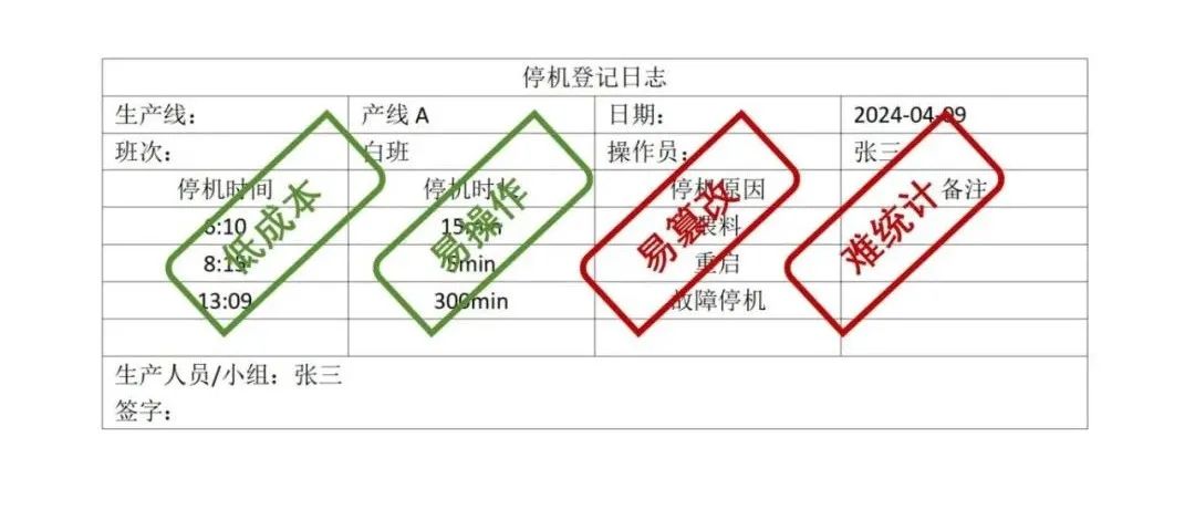 以往,记录设备停机常采用低成本、操作简便的手动录入方式,但因其缺乏统一标准,且易被人为篡改,在影响数据准确性与真实性的同时,也难以对设备异常情况进行有效统计与分析。