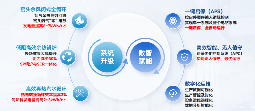 公司最新一代的余热发电技术,通过APS技术、专家优化APC系统、数字化运维等数智技术,实现了余热电站一键启停、无人值守、数字化运维等,电站定员缩减50%,大大提升了生产效率。“水泥余热发电工业互联网平台”及“余热发电大数据平台关键技术研发及产业化”分别被列入2022年度国家工信部工业互联网及大数据产业发展试点示范项目。