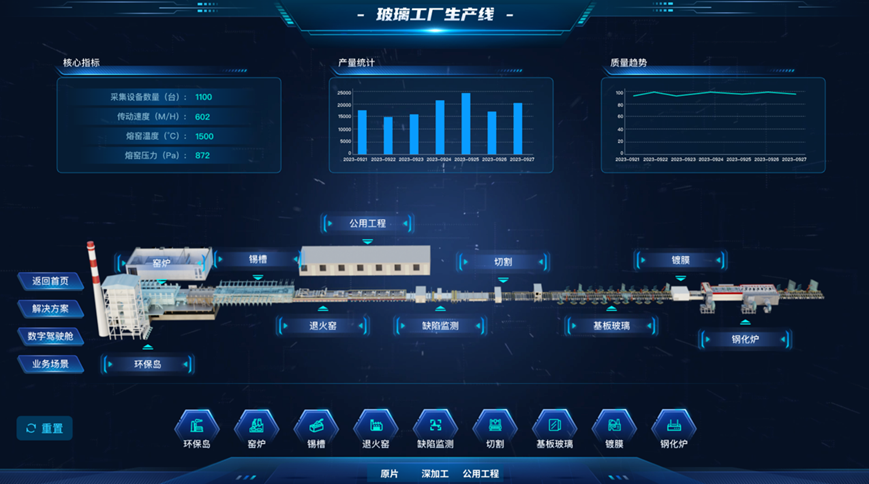 工业互联网创新中心基于行业数智化升级和绿色可持续发展需求,围绕生产、设备、质量、能源、安全,建设数字化应用和智能化场景,构建玻璃行业“工业物联网+工业大数据”智脑双核,一是链接人、设备、原料、操作、产品等要素,实现效率、质量、能源三大管理核心透明化;二是基于全流程的实时感知,打开“成本黑洞”;三是应用智能算法和大数据分析,实现过程管控的全局协同。