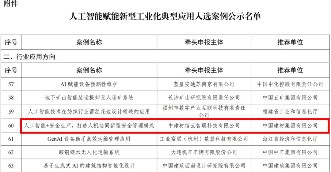 近日,工业和信息化部发布了《人工智能赋能新型工业化典型应用入选案例公示名单》。此次案例征集,自2024年8月份起在全国范围内启动,历时三个多月,要求企业具备人工智能赋能新型工业化核心能力,同时,申报案例已实际落地并取得成效,具有示范引领作用,能够为相关行业或企业智能化升级具有借鉴意义和推广价值。经过专家团队的层层遴选与严格评审, 旗下企业信云智联与天山材料共同推出的“人工智能+安全生产,打造人机协同新型安全管理模式”方案入选案例名单。