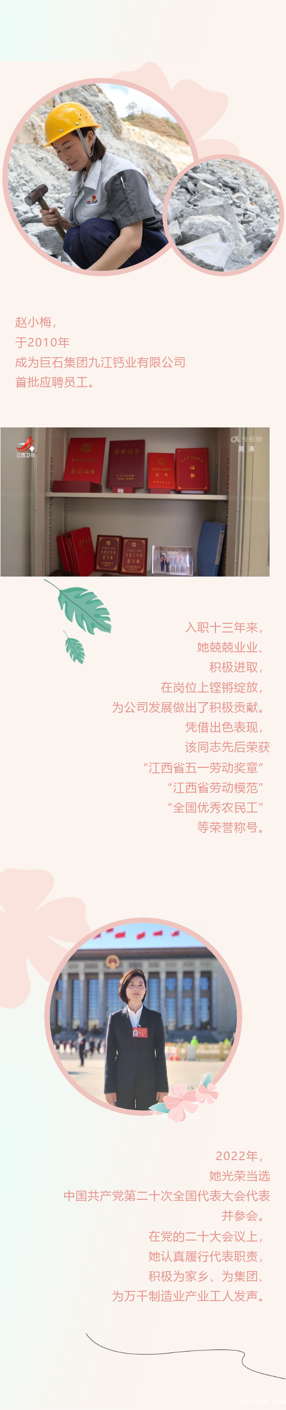赵小梅,于2010年成为巨石集团九江钙业有限公司首批应聘员工。入职十三年来,她兢兢业业、积极进取,从农民工到公司技术骨干、从原料检测到管控立窑生产工艺、从普通职工到党的二十大代表,铿锵玫瑰璀璨绽放,在实现自身价值的同时,为集团公司的发展和家乡的经济建设贡献了自己的力量。