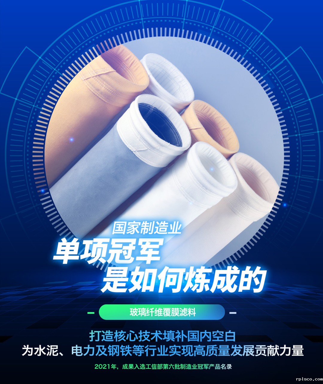 玻璃纤维覆膜滤料是南京玻纤院拥有自主知识产权的主导产品,是工业袋式除尘器的核心材料,其以玻璃纤维布、玻璃纤维复合毡为主要基材,与PTFE薄膜经热压工艺覆合而制成的一种过滤材料,具有耐高温、高效低阻的特效。它主要应用于电力、水泥及钢铁等行业的粉尘净化收集。南京玻纤院通过产品技术更新迭代,不断提高产品性能,打破了国外技术封锁和产品垄断。该技术产品推广以来为实现碳达峰、碳中和提供保障,促进我国水泥、电力及钢铁等行业实现可持续发展和高质量发展。