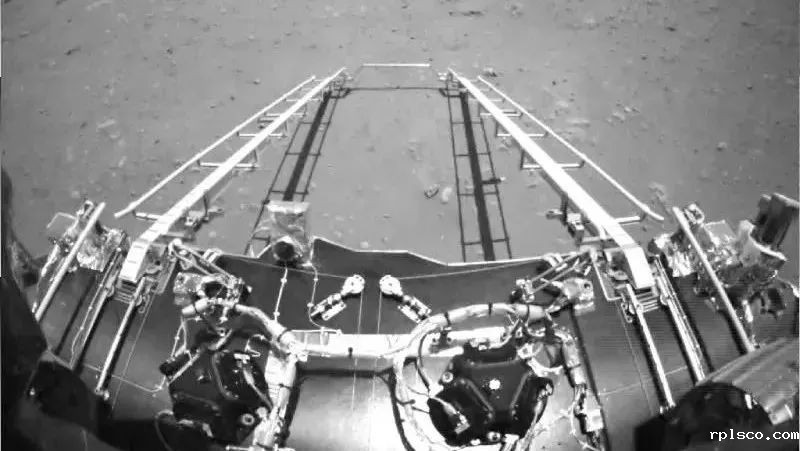 该图由火星车前避障相机拍摄,正对火星车前进方向。图中可见坡道机构展开正常,图像上部两个伸杆为已经展开到位的次表层雷达,其中巡视器次表层探测雷达天线罩管为哈玻院配套研制。(国家航天局供图)