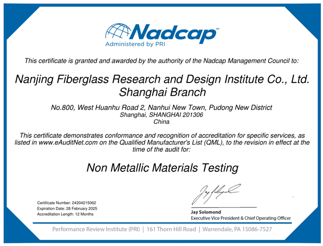 南京玻纤院上海分公司成功取得NADCAP NMMT认证证书