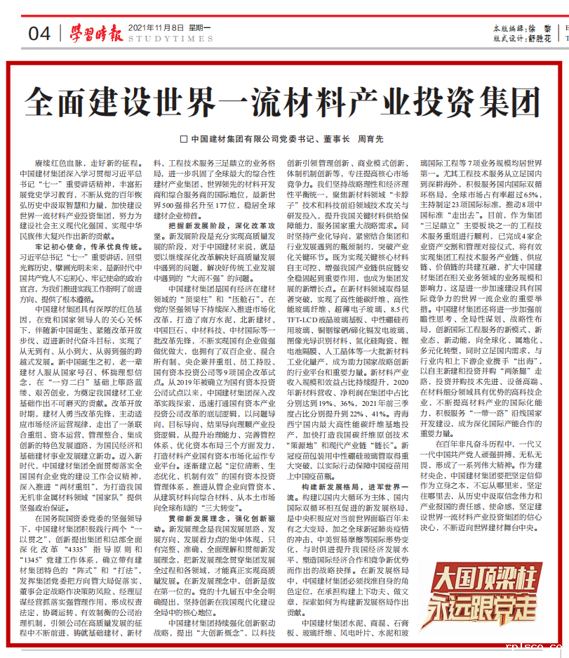 在百年非凡奋斗历程中,一代又一代中国共产党人顽强拼搏、无私无畏,形成了一系列伟大精神。作为建材央企,taptap体育要把坚定信仰作为立身之本,不忘从哪里来,坚定往哪里去,从历史中汲取信念伟力和产业报国的责任感、使命感,坚定建设世界一流材料产业投资集团的信心决心,不断迈向世界建材舞台中央。