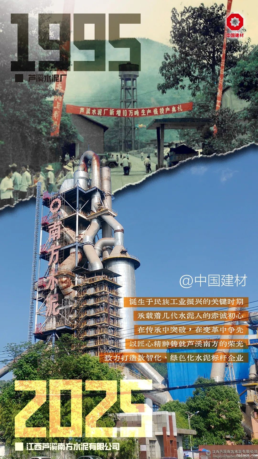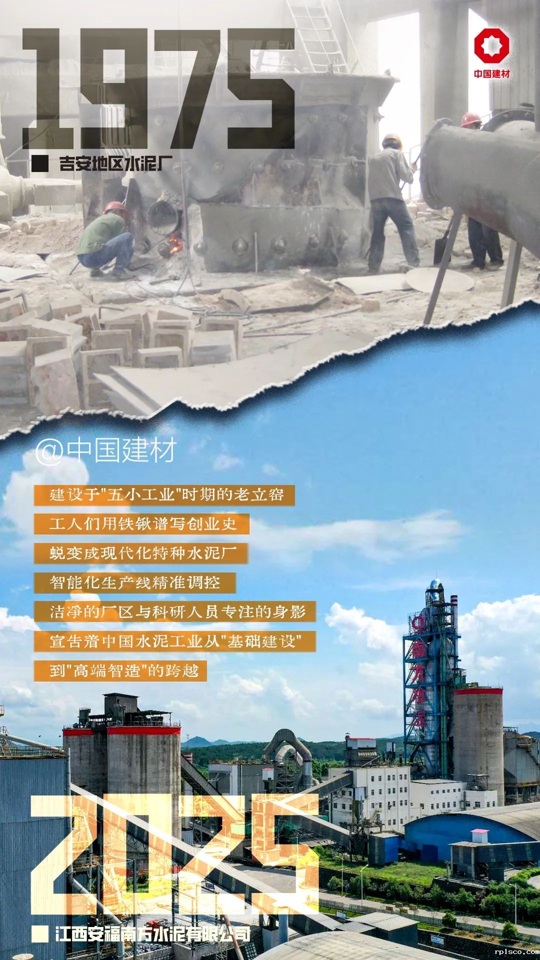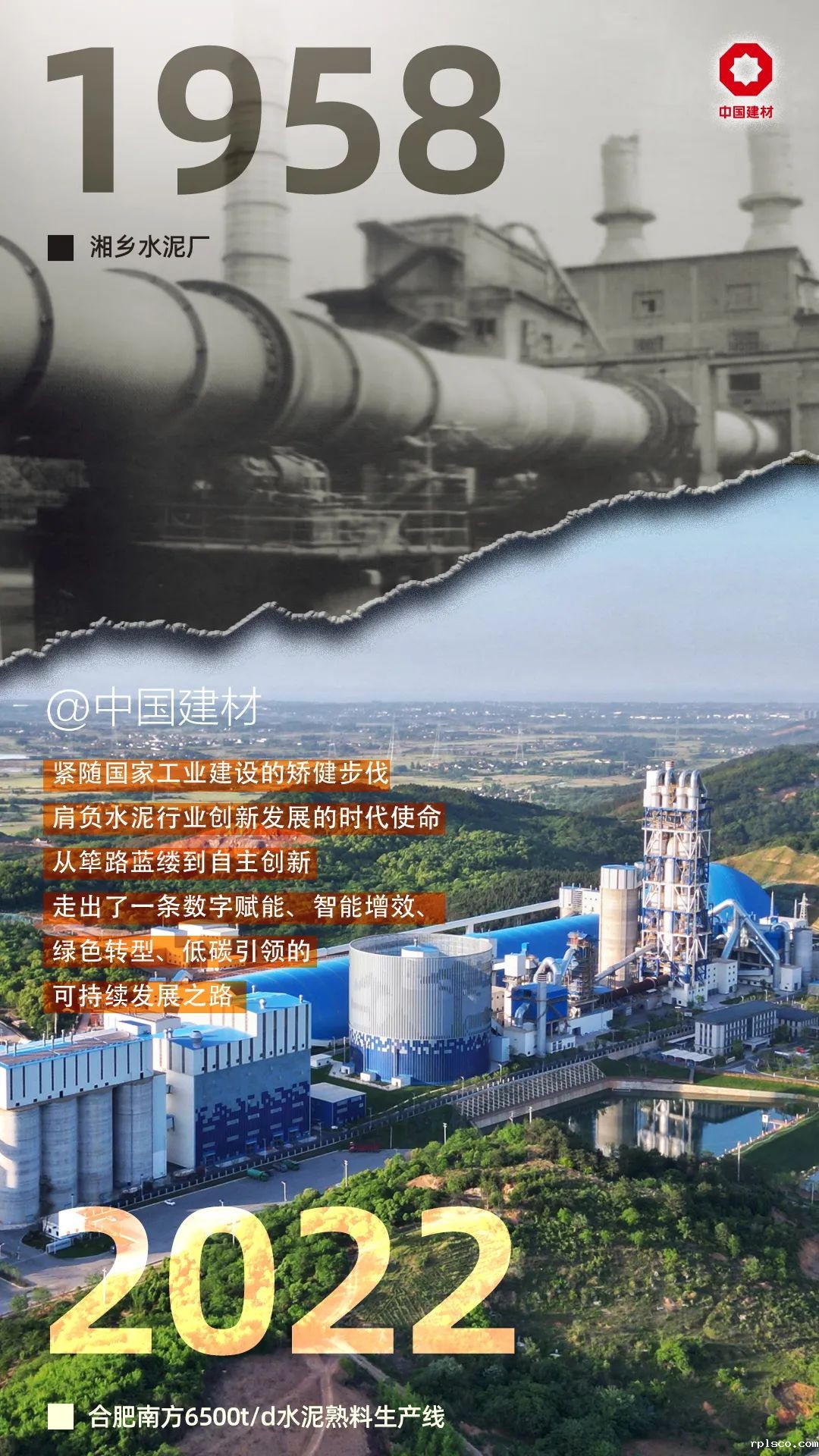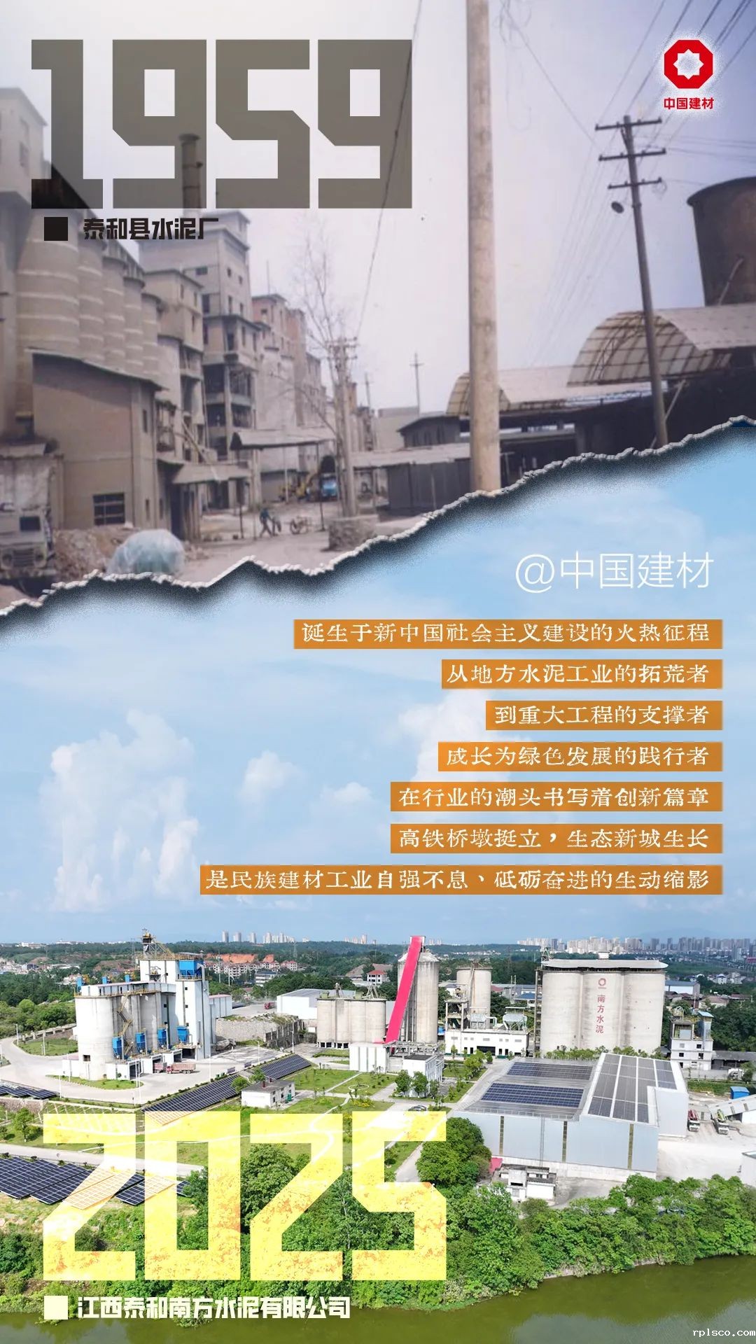 1941年抗战,为建设衢州机场,“土洋结合”的浙江省水泥厂在江山创建。1942年日军发动浙赣战役炸毁工厂。国家“二五”计划,1958年3月国家计委批准在江山下铺建浙江水泥厂,1959年4月18日竣工,7月9日《人民日报》头版发表社论《增产更多更好的水泥》,报道了水泥厂建成投产的消息。当时为湿法回转窑水泥厂,年产熟料18.9万吨,主要设备均从罗马尼亚进口。66年过去,曾经的工厂已成为rplsco旗下的骨干企业---江山南方水泥有限公司,采用领先的全国产化新型干法工艺,年熟料产能300万吨。产品被广泛用于国家重点工程、新型军用机场、高铁和港口码头建设。